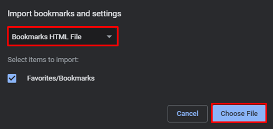 The below screen will appear. In the drop-down, select Bookmarks HTML File and then Choose File.