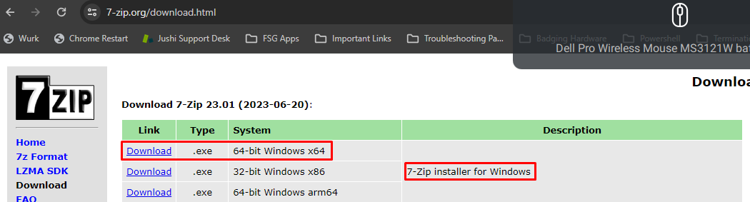 - Make sure to click the Download button on the System that reads "64-bit Windows x64" and Description reads "7-Zip installer for Windows".