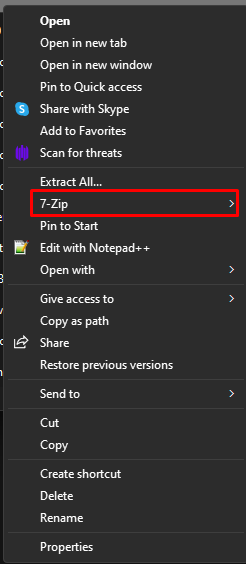 - (Only if using Windows 11) When right-clicking the folder, you must first choose the option called "Show more options" before you are able to see the 7-zip option.