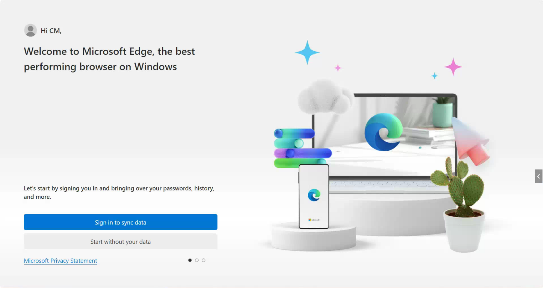 - Open Microsoft Edge for the first time by using the bottom-left Windows search bar to find and open it. You will see the following screen.