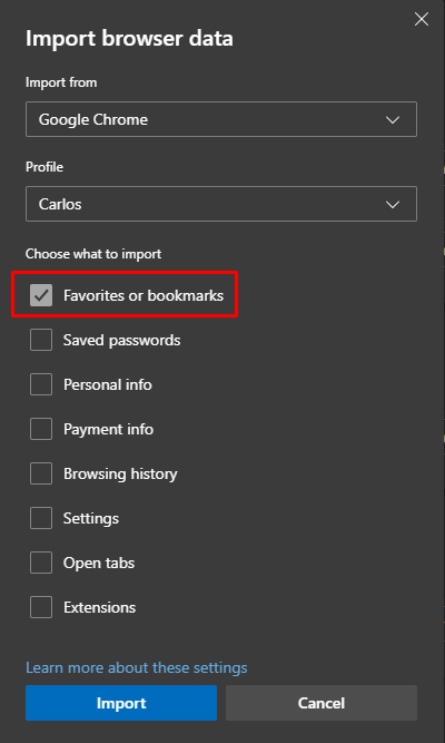 Importing Bookmarks from Chrome into Edge as Favorites