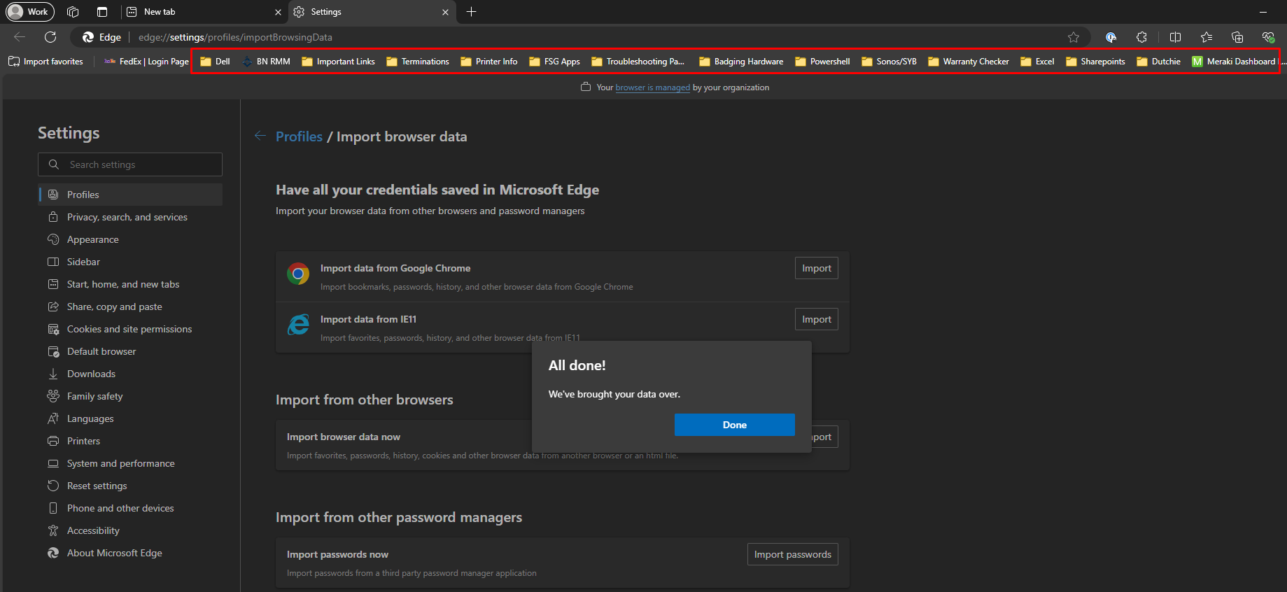 - You will see a pop-up that says "All done! We've brought your data over". In the following image you can see that bookmarks have been brought over and have landed in the Favorites bar along the top of the browser. At this point you can click the "Done" button.