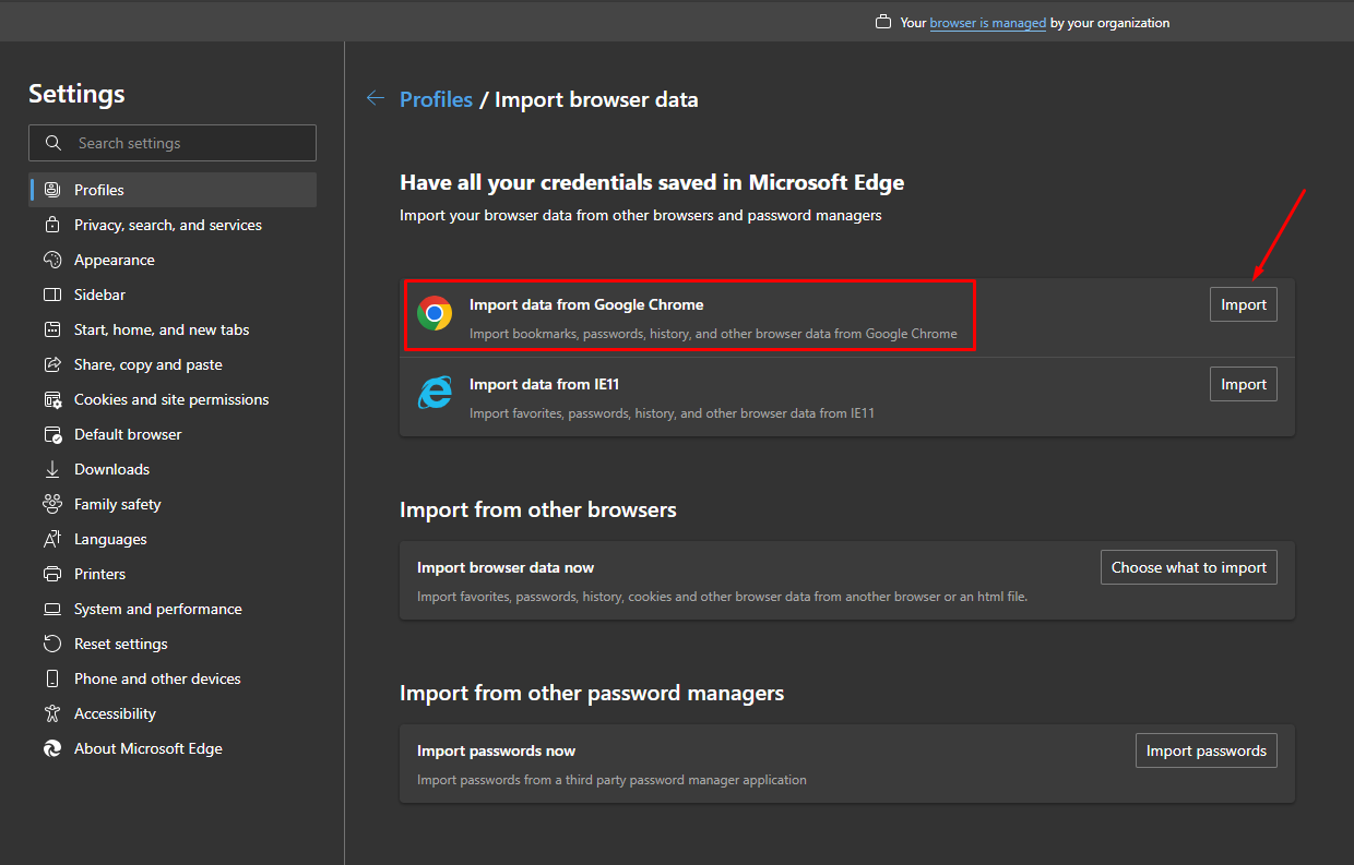 - You will be taken to the following page. Click on the "Import" button on the line that says "Import data from Google Chrome".