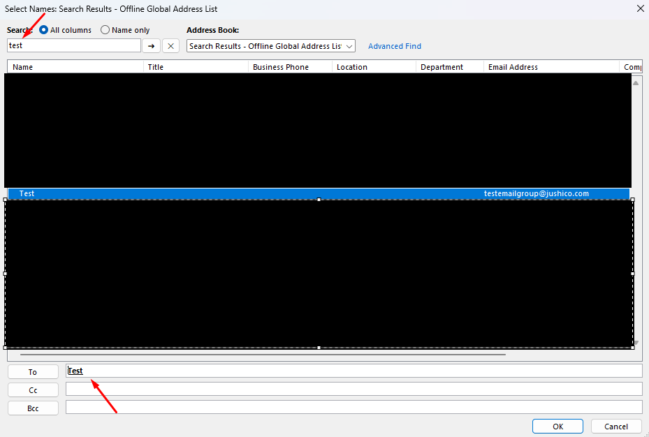 - In the Search box type the name of your distribution list (partial is ok)