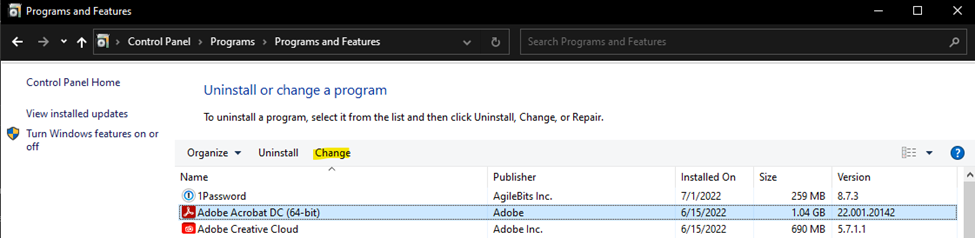 - Look for the Adobe Acrobat DC or Adobe Reader program, click on it, and click the “Change button” above it.