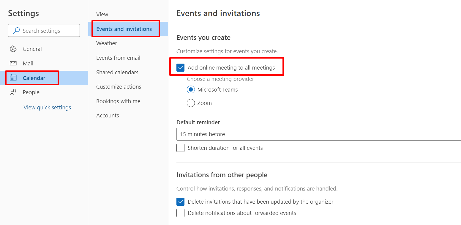 - Next, navigate to Calendar, then Events and invitations, and then uncheck the “Add online meeting to all meetings” box.