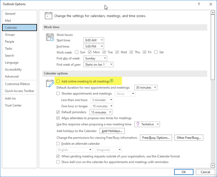 - Navigate to the Calendar tab on the left and uncheck the “Add online meeting to all meetings” box under the “Calendar options” heading.