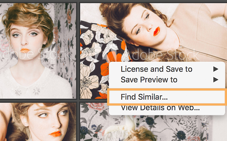 - Find Similar Images - To find images similar to a particular image displayed in the Adobe Stock search results, right-click the image and choose Find Similar.