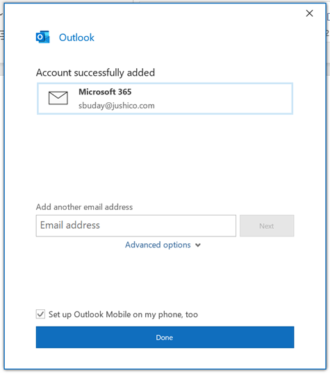 - Outlook will let you know that your account was successfully added with a screen as shown in the image below. Click “Done” for Outlook to open.