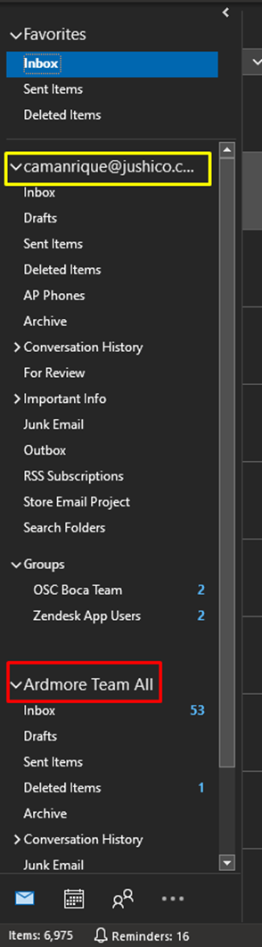 - Along the left-hand side of Outlook, as you scroll up and down, you will see all your email folders. Under your work email folders, you will find the store email inbox and its folders, as shown in the images below. You can expand the arrow next to the display name of the store email to see or hide all its folders. In this example I am using the Ardmore store email to demonstrate – my work email is boxed in yellow, and the store email is boxed in red.