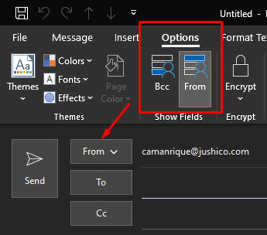 - Go to the Options tab and click on the “From” button to allow the “From” field to show up. You only need to do this once for your profile.